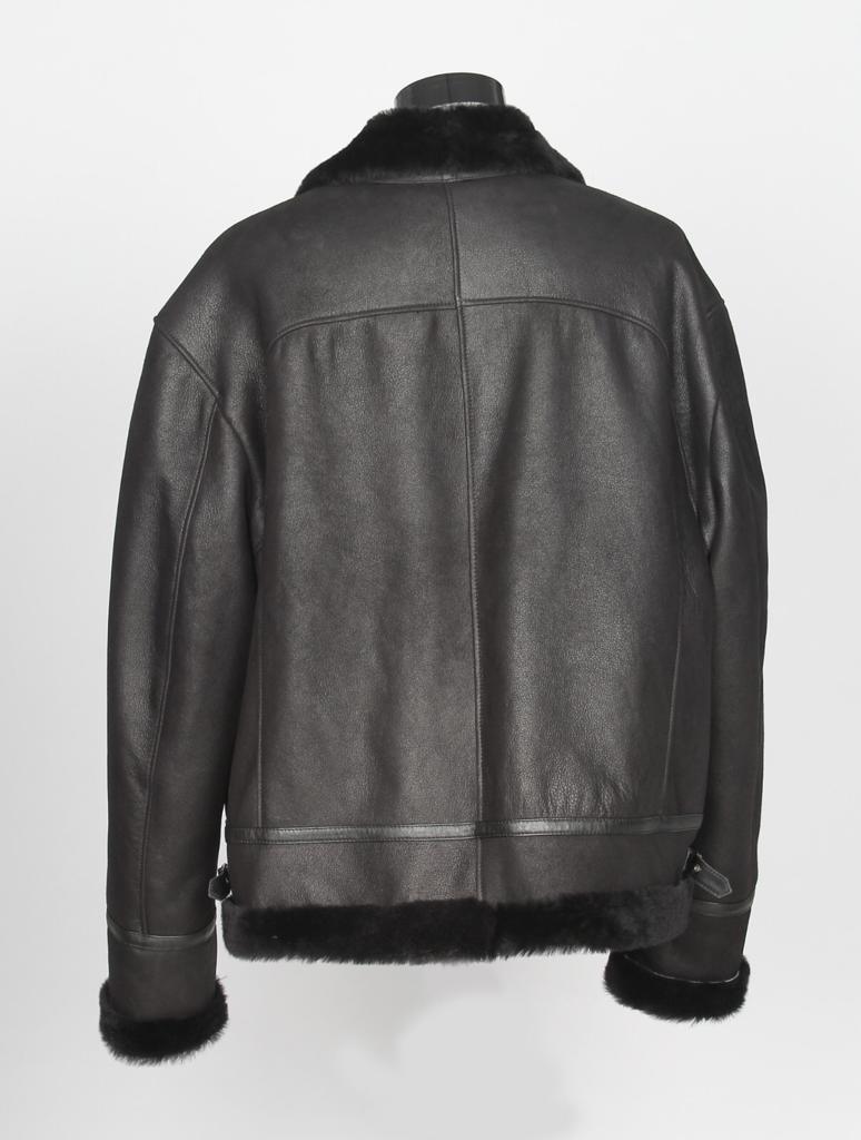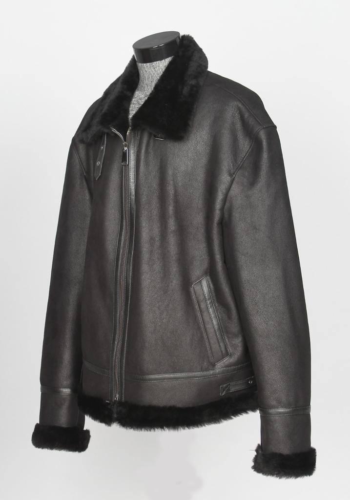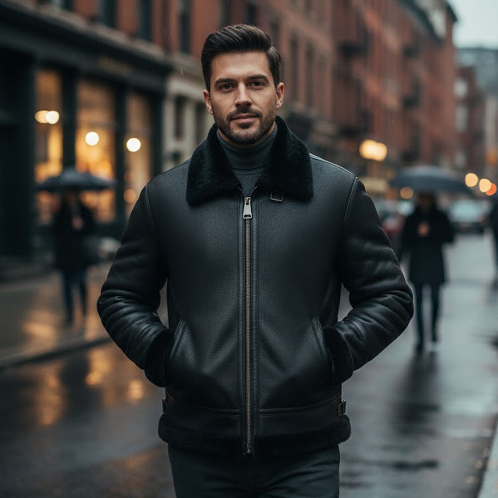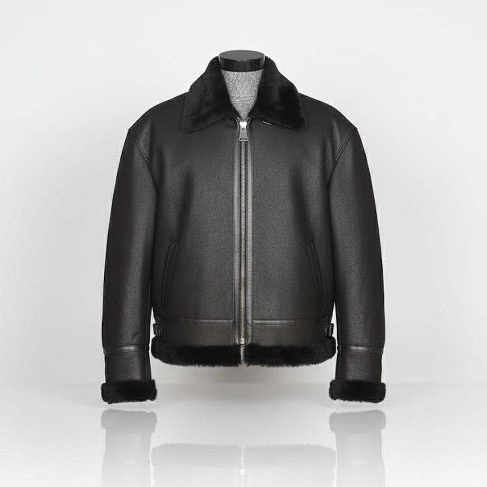 Men’s Authentic B2 Aviator Real Sheepskin Shearling Fur Jacket with removable hood (Black B2)